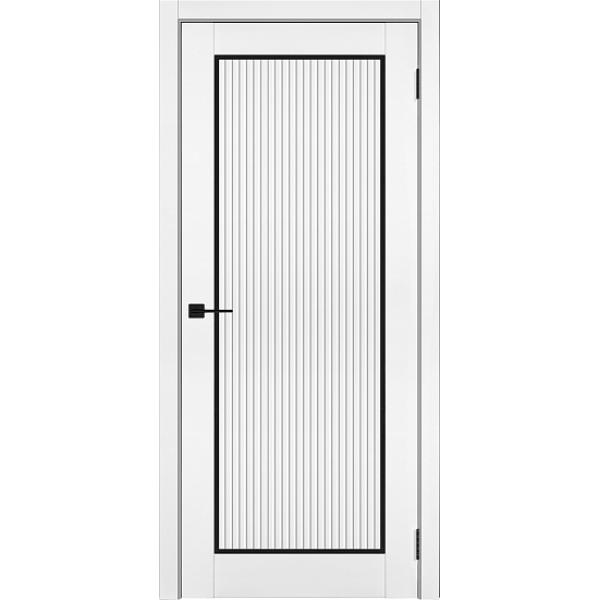 Крепкая дверь сборной конструкции с черным молдингом вокруг филенки, покрыта ПЭТ-пленкой, имитирующей эмаль, имеет современный внешний вид, цвет снежно-белый .