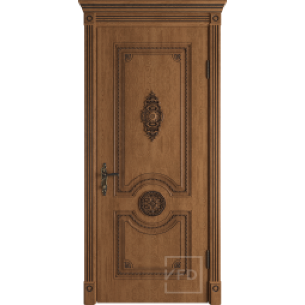Данная модель представляет собой классическое изделие под ПВХ-пленкой , крепкое, качественное, полностью имитирующее натуральное дерево цвета ЗОЛОТИСТОГО ДУБА с ТЕМНОЙ ПАТИНОЙ. Производитель предлагает к дверям коробки шириной 80 мм, наличники, расширители коробок. Весь погонаж телескопический. Так же есть в наличии украшения в виде резных капителей, банкеток и розеток.