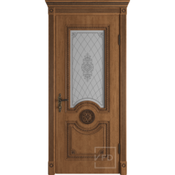 Данная модель представляет собой классическое изделие под ПВХ-пленкой , крепкое, качественное, полностью имитирующее натуральное дерево цвета ЗОЛОТИСТОГО ДУБА с ТЕМНОЙ ПАТИНОЙ. Производитель предлагает к дверям коробки шириной 80 мм, наличники, расширители коробок. Весь погонаж телескопический. Так же есть в наличии украшения в виде резных капителей, банкеток и розеток.